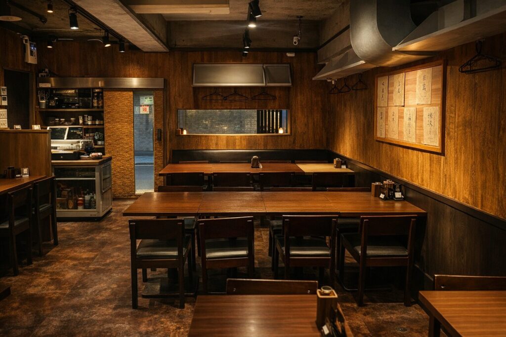 木の質感とやわらかな照明が心地よい、1Fのテーブル席フロア。和モダンで落ち着いた空間は、会社の飲み会や同僚との食事はもちろん、女子会やゆっくり語り合いたい夜にもおすすめです。